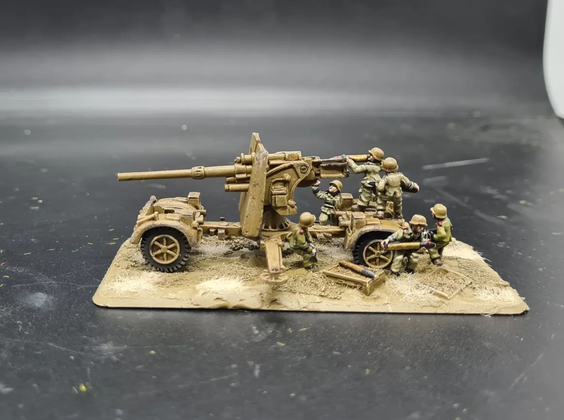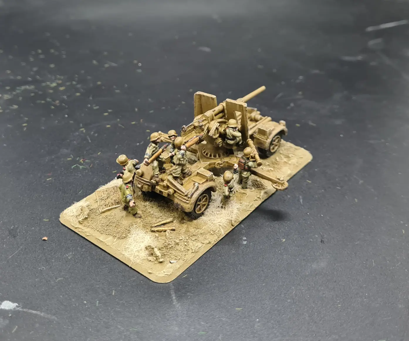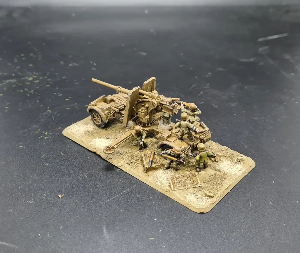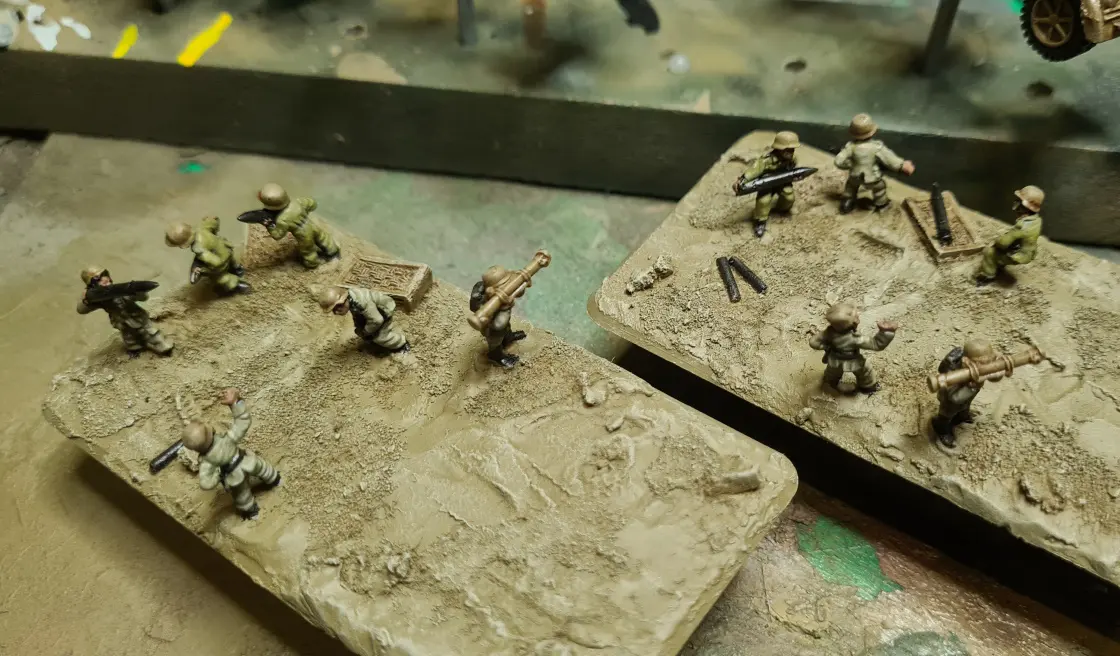 Lookin’ AWESOME! Regarding your extra-large bases for the 88s – back in my v3 days I turned the “workshop” kit (the one with the mechanic working on a panther engine) into an arty HQ. It turned out really great, with a big ole antenna on the truck and radio equipment on the workbench, but my point is: an arty HQ was normally on a medium base while the kit was modeled on a large base. NOT wanting to give my opponents more base to target I notched the sides of the large base to delineate x2 medium bases and then did a slightly different basing treatment on one half – enough to easily distinguish the two sides visually at table distance but not so much that it looked weird. I then designated one half of the mini-diorama as the “active” part of the model – the actual, in-play arty HQ – and the other half as “inactive.” I helped my opponents out by concentrating the HQ figures on the active side. I never had anyone complain but I also only played friendly games, not tournaments…