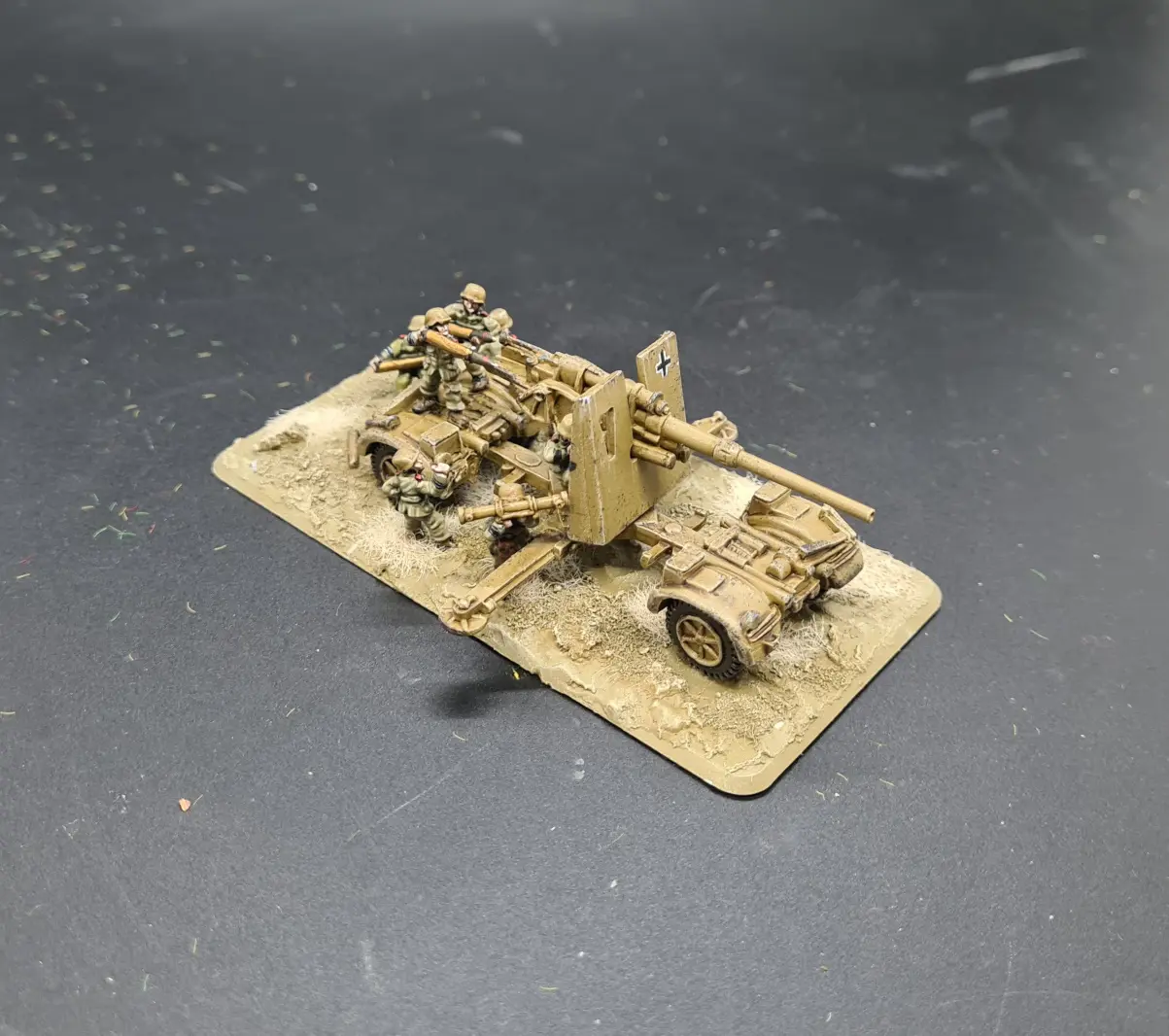 The 88 were mounted to an oversized base, made from gluing a medium base to a large base.  It used to be in v2 and 3 that you could model the 88 with extra crew to increase the RoF to 3 and the crew were typically on a separate base.  As the cost was generally quite low, you generally always took the extra crew so modelling the two bases together was relatively common.  It does make the gun easier to target with artillery but it allows the carriage to be fitted so rule of cool wins out.