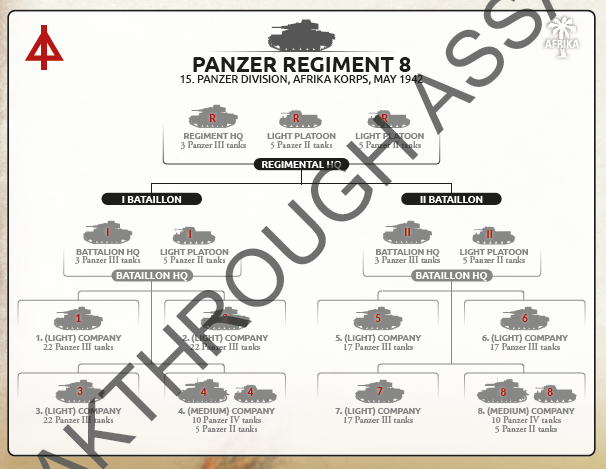 One of the neat parts of the Afrikakorps book (and happily still present in the new compilation) was that it has a divisional diagram that shows the turret numbers used by each company of panzerregiment 8.  The tanks in the regiment were unusual in only displaying one red number or letter on the turret sides rather than the more typical three digit number.