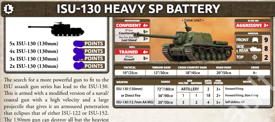 The Soviet special purpose tank regiment differs from the others in that it doesn’t allow you to take any of the “normal” leviathans. Also the new Leviathans in this PDF are not that excessive; we have already seen 2 of them in Fate of a Nation as some of the older tank options, but here they are shiny and new.