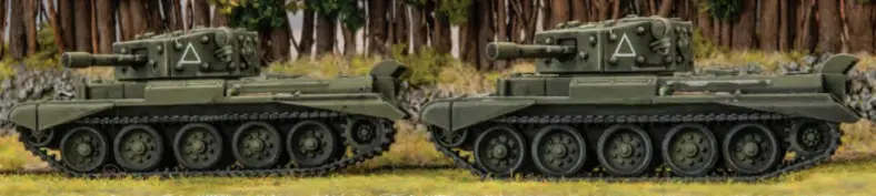 Desert Rats Cromwell Armoured Squadron:  These are the non recce versions and come in platoons of up to 4 with three Cromwells and a single Firefly.  This allows you to keep the Firefly in overwatch while your other three hulls press ahead.  Being 7th Armoured, just like previous versions, you have a 5+ motivation although retain a 3+ remount.