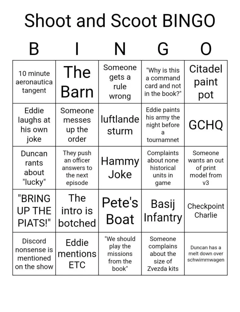 One of our patrons and regular guest writer, Mike Robinson, knocked up this handy Shoot and Scoot bingo card generator. Give it a go whilst listening to Episode 84!