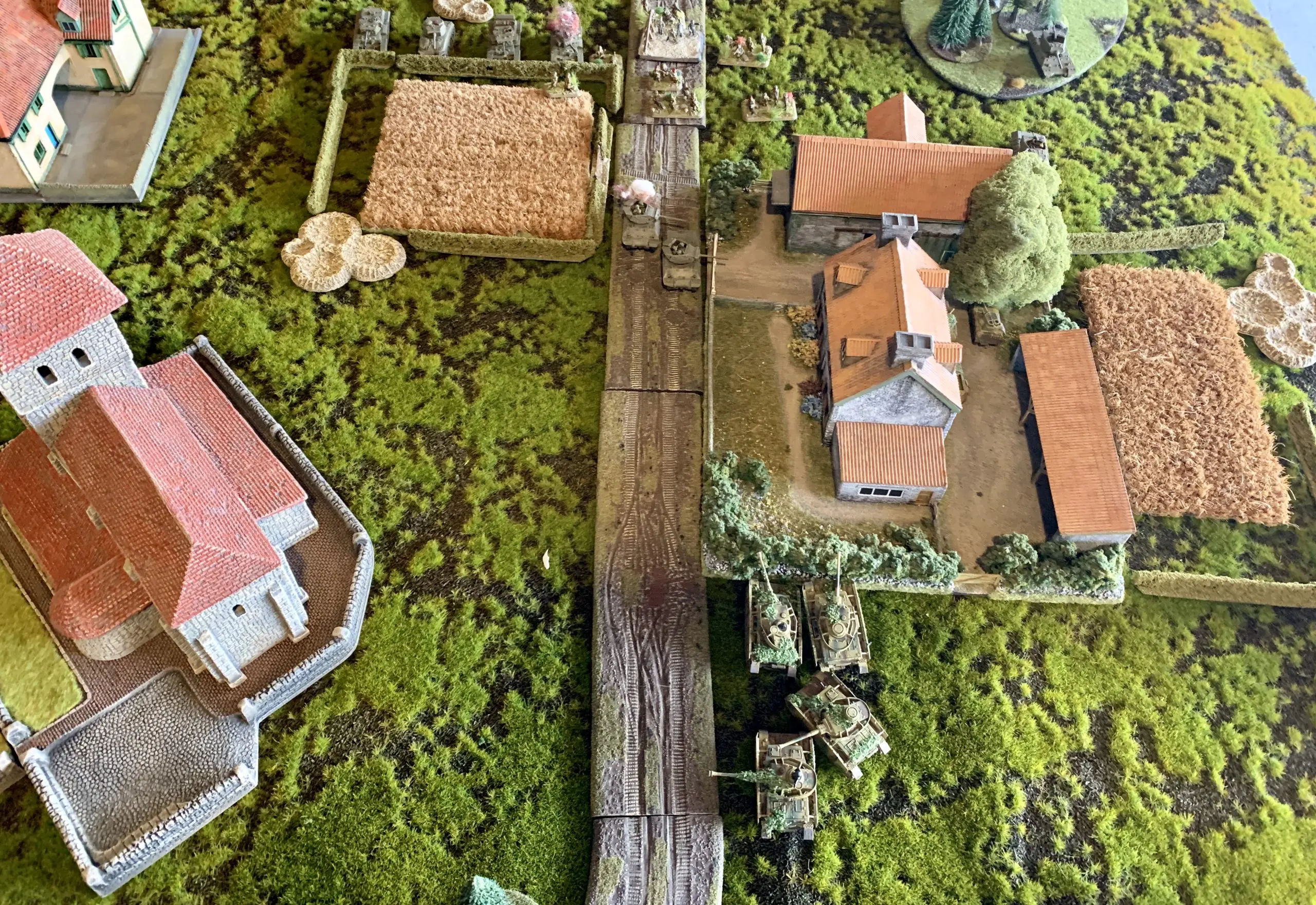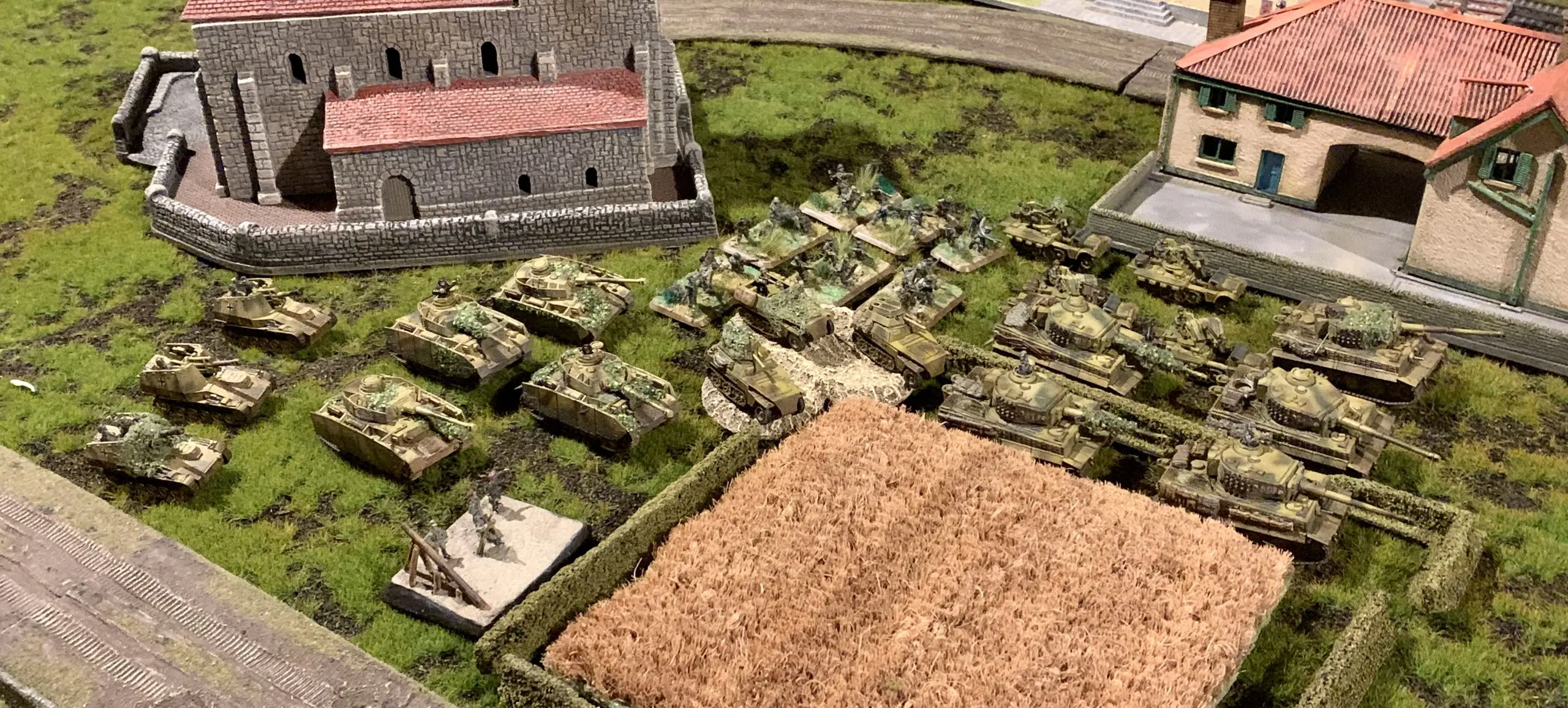 Paul got first turn and advanced his Achilles on the right flank.  2 failed cross-checks so only 2 moved up the hedge.  He also hit a Wespe (wouldn’t have happened as Heer!).  His small Cromwell platoon advanced on my left flank and he took a shot with his Firefly, luckily missing.