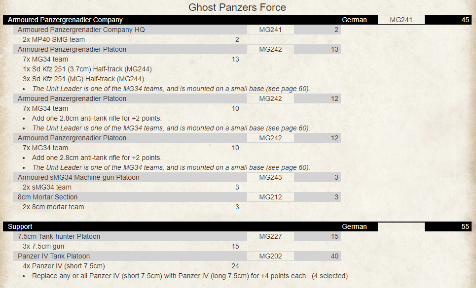 Tactical comment: I generally find German forces hardest to defeat when they can mass on a narrow front where their overall lack of numbers is far less significant. If you can spread them out across the table somehow they can be much easier to deal with. The generally smaller platoon sizes and lower numbers of platoons will start to have a significant impact on the forces overall effectiveness in controlling the flow of the game.