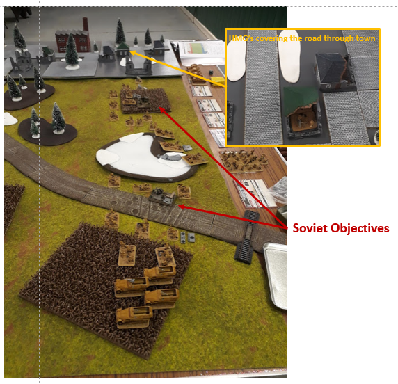 The T-70s and SMG platoon opened fire on the HMG’s killing one. I could now assault the pinned team safely with the SMG unit and finished them off.