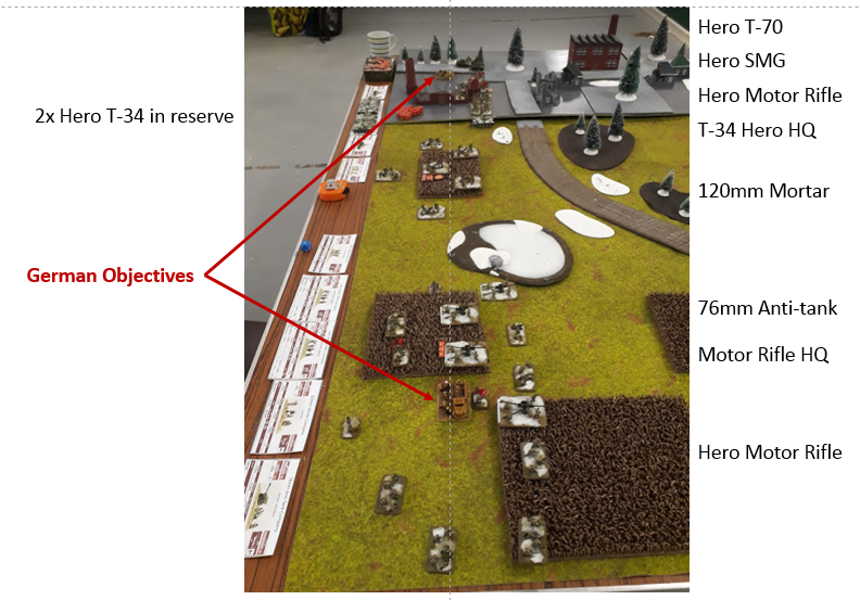 My 120mm mortars primary aim is to neutralise the PaK 40’s and would form the base from which I would launch the Hero Rifle and SMG companies into the offensive. The 76mm AT guns would deter an armoured assault against the objective in the open and I could roll the guns forward if the opportunity was presented. This will leave the T-70 unit free to roam around the table to prevent the Germans massing their troops into a single thrust which I might struggle to stop.