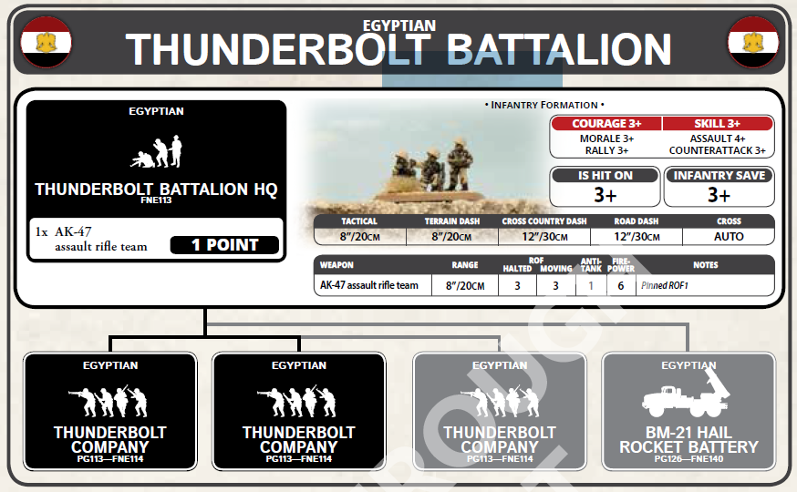 The addition of the second AT-3 Sagger missile and SA-7 Grail means that each Thunderbolt Company is its own self-contained force capable of threatening all three adversary types; armour, infantry and aircraft.