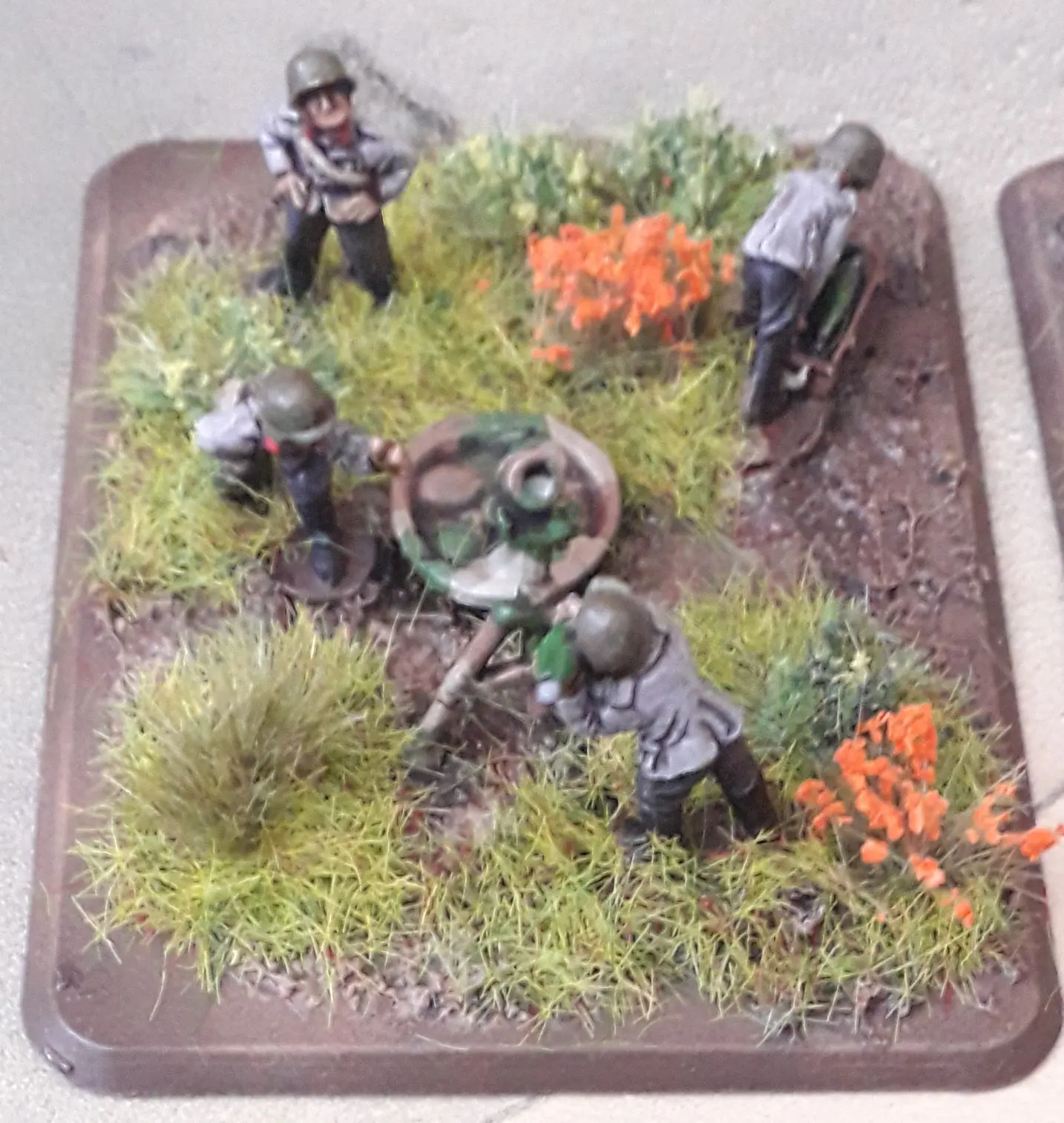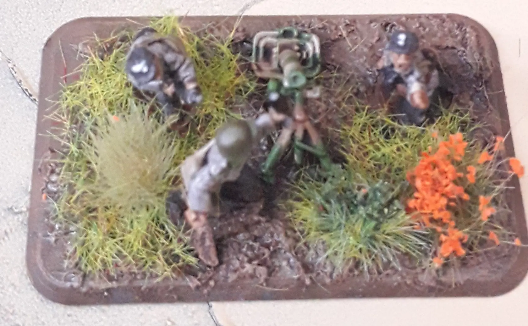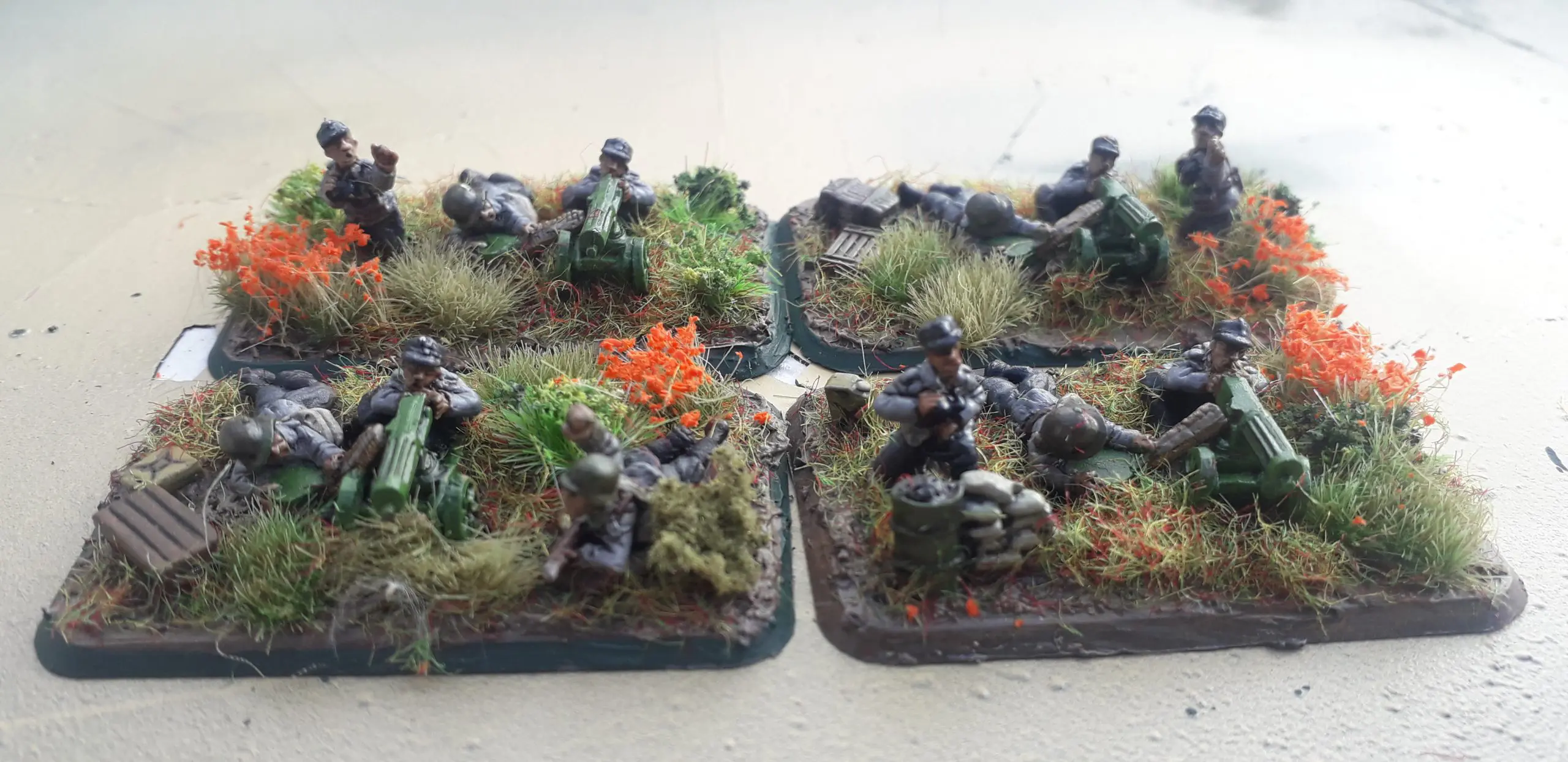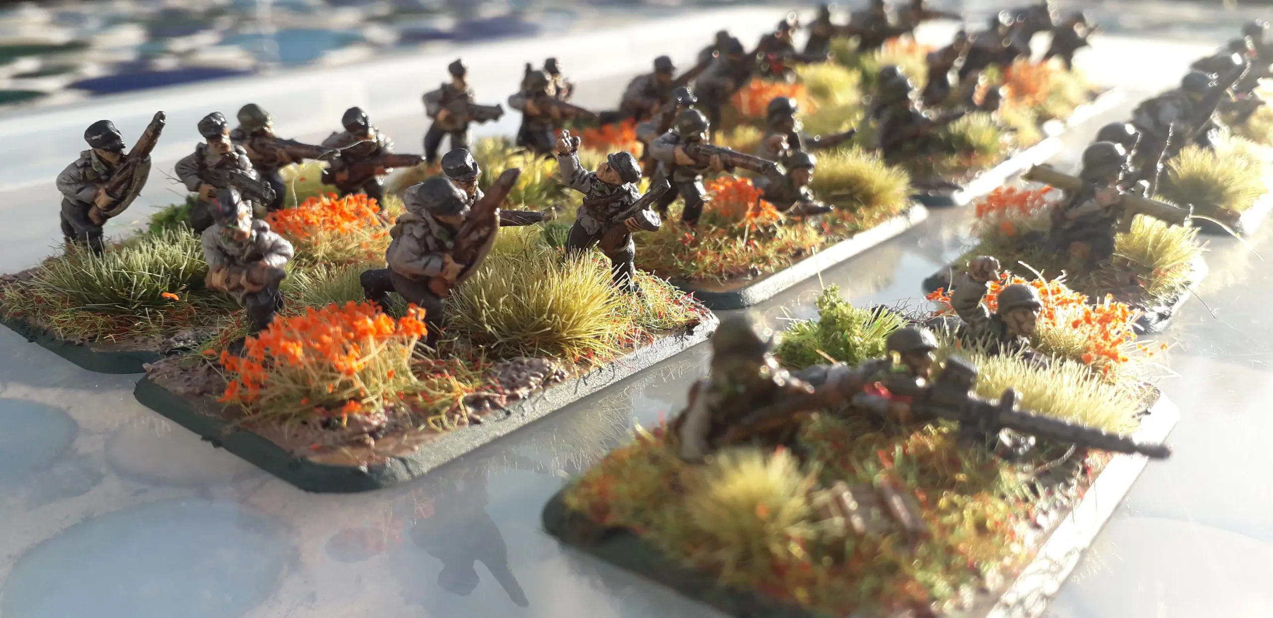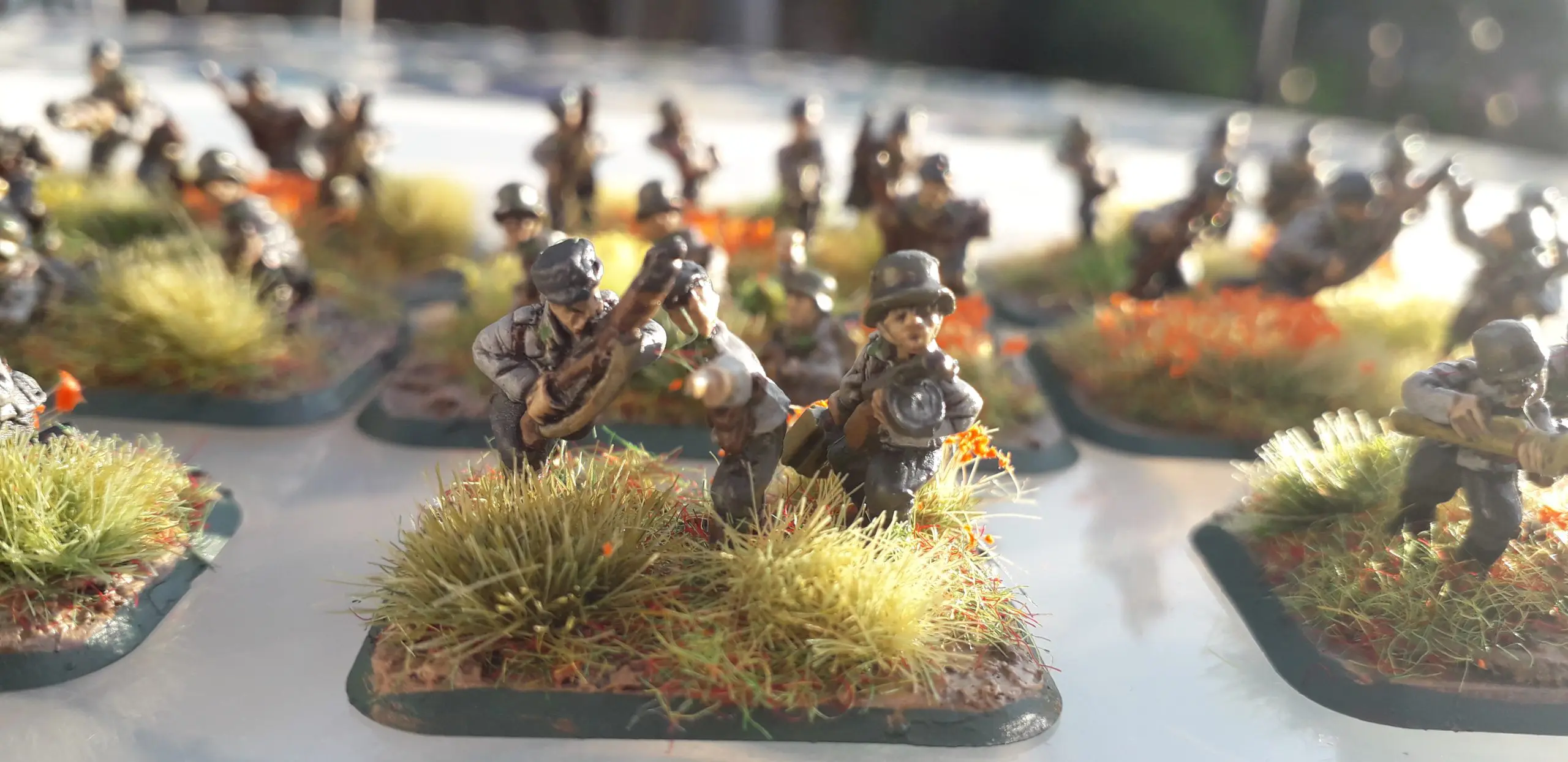 I have used a basing scheme based on the idea of a summer meadow to hopefully make them stand out on the table. For this I principally used the Gamergrass summer meadow tuft set and flowers, with some additional Debris of War tufts stuck to a base layer of Noch summer meadow flock. All platoons have orange flowers, fairly common in late summer, which contrast well against the grey uniforms and green equipment, to make it easier to tell the infantry platoons apart more easily on the table top.