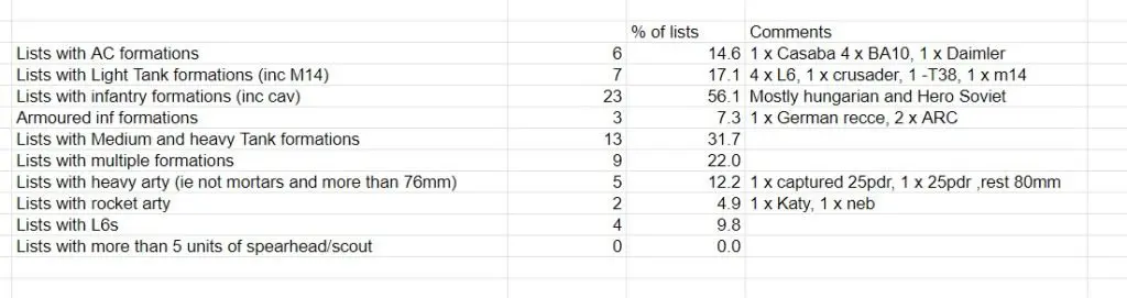 2. Medium armour is present in over 1/3 of the lists. Again some are paired with infantry or light vehicles but there are a significant number of ‘proper’ lists as well. That said Soviets account for a lot of it and it is harder to define due to the oddities such as double Stuarts (light tank) allowed in a Lee Battalion.
