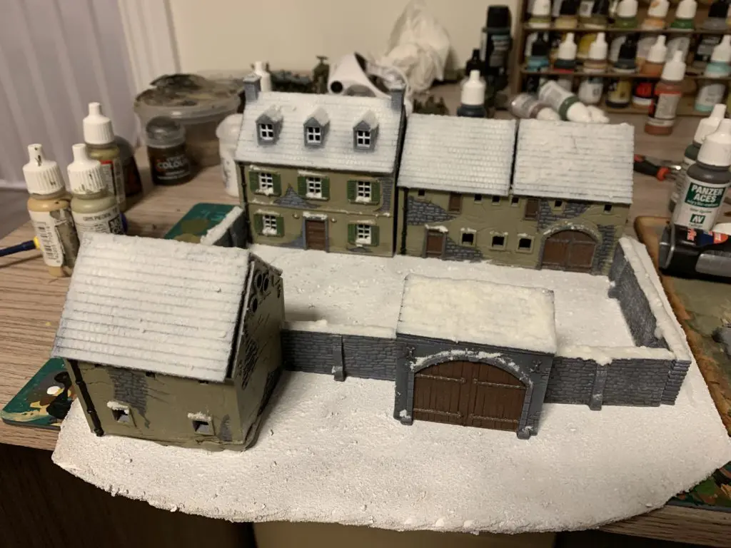 I came across Woodland Scenic Foam Putty which I discovered works wonders for snow. Its a thick foam that is very malleable but can be hard to apply. I had to mix it with a small amount of water to make a paste and then applied it to the whole base, roofs and walls. As it dries you can also use thick areas to make track marks by pushing a model into it and make little foot prints. Pretty cool!