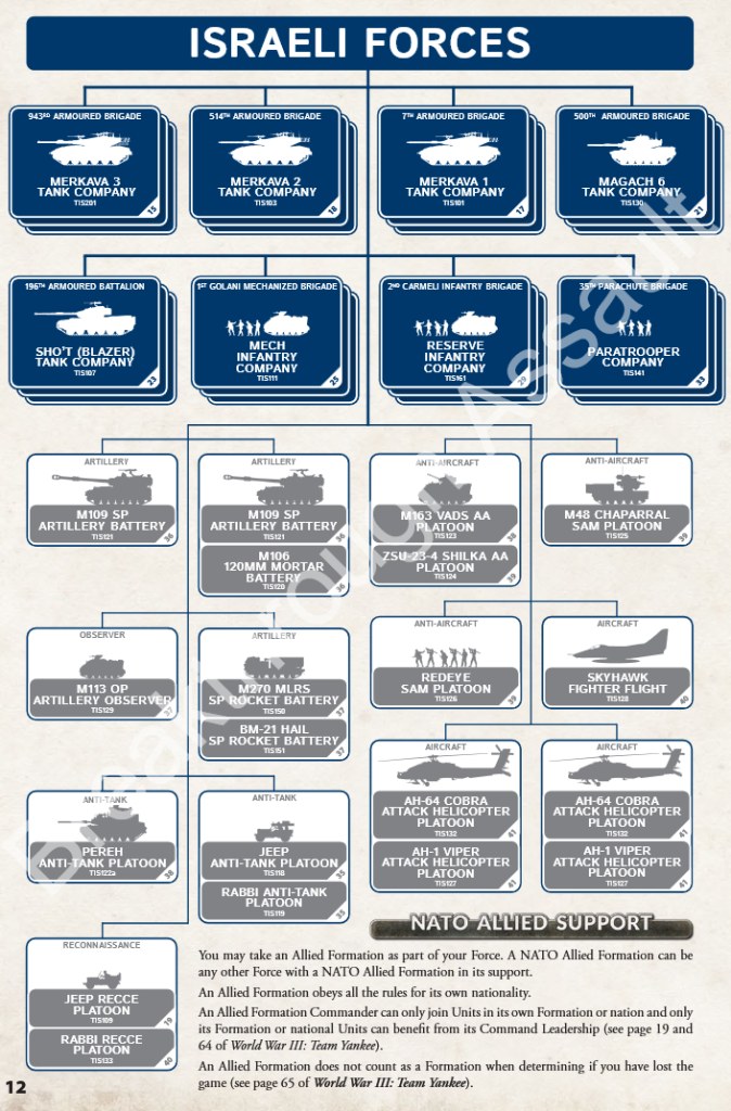Enter “WW3: Team Yankee Israeli”. Covering just the IDF in a single book allows for more room for new units and formations, and we see the counter of the latter grow from four formations in Oil Wars (three tank and one infantry) to eight (five tank and three infantry). The formation count is now: