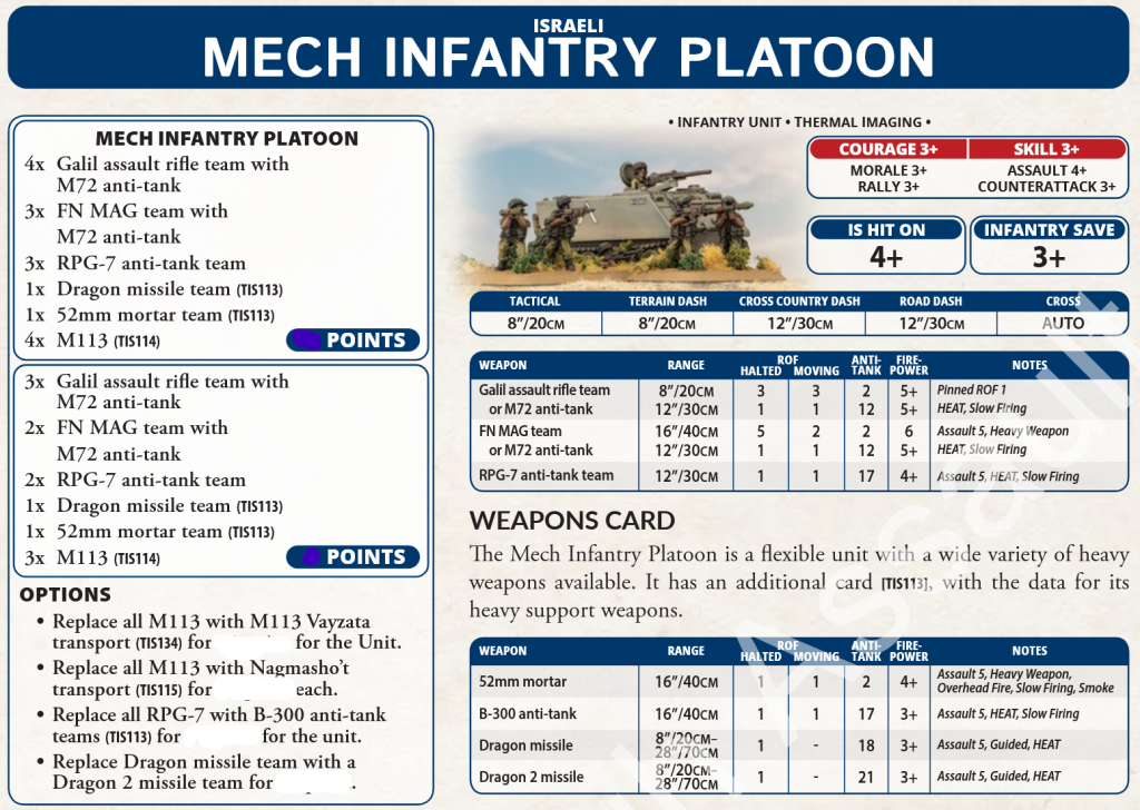 The rest of the formation sees a few little tweaks. The tank box has all the tanks in the force available, the M125 81mm mortar unit remains unchanged, whilst the M150 TOW carrier receives the option of taking either the US built ITOW or the Israeli built Man Portable Anti-Tank System (MAPATS – coincidently the Hebrew word for Explosion), a laser guided derivative which not only has AT23 but also a 56″ range too (no wire to limit the range!). This replaces the TOW2 option that was briefly introduced in the web upgrade. Also, like Dragon 2 and TOW2, if you take MAPATS, everyone who has the choice has to take MAPATS.