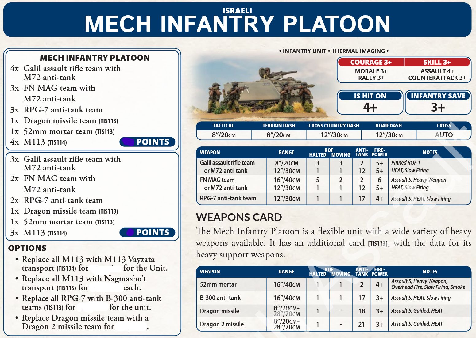 The next infantry unit is the Reserve Infantry Company. We’ve seen reservists in the British (Fox Recce Squadron) and German (Jaeger Company) books and the IDF model follows much the same route; a broadly similar weapon fit but “softer” soft stats. In the case of the IDF, the reservists have a still very respectable “all fours” set of soft stats, much like most NATO forces. Their infantry platoon has the same composition as the full-time army albeit with the M113 being optional and no fancy APC.