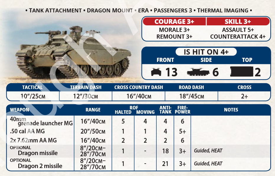 Looking at the infantry platoon itself, the Dragon can now be upgraded to a Dragon 2 (boosting it to a very useful AT21) and the RPG-7 can be replaced by the B-300, the weapon which the US would later adopt as the SMAW). The latter effectively boosts the range from 12″ to 16″, plus ups the firepower to 3+, which has its uses but is an easy upgrade to skip to save cost.
